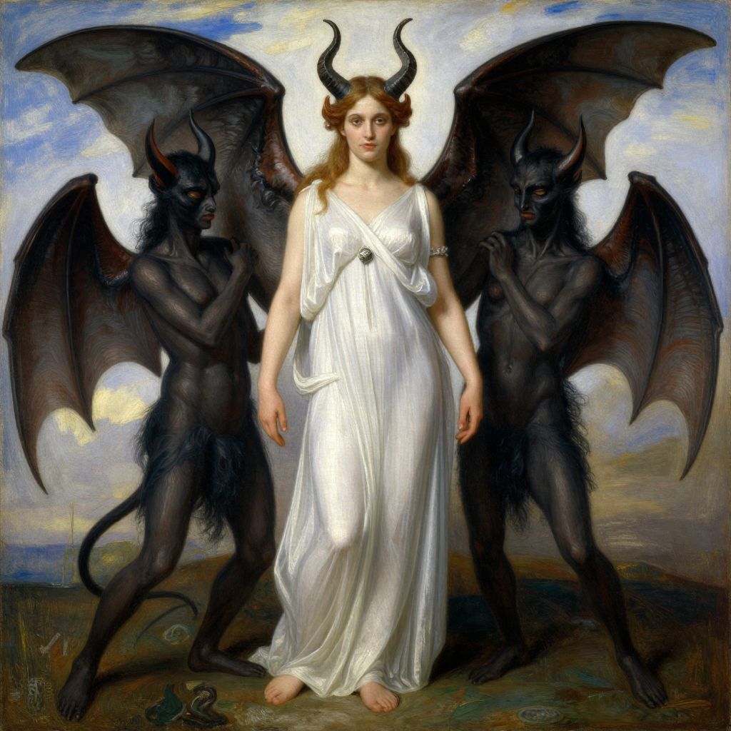 Digital painting of a pale, horned woman in a white dress flanked by two black, winged demons with muscular builds and glowing eyes. Dark