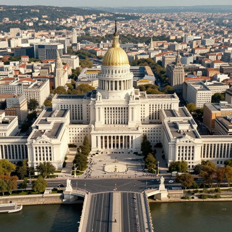 A capital city generator visualization showing a massive urban hub with a central government complex, marble statues, wide boulevards, and interconnected bridges over rivers, dynamic aerial perspective, warm natural colors, immersive detail, realistic style