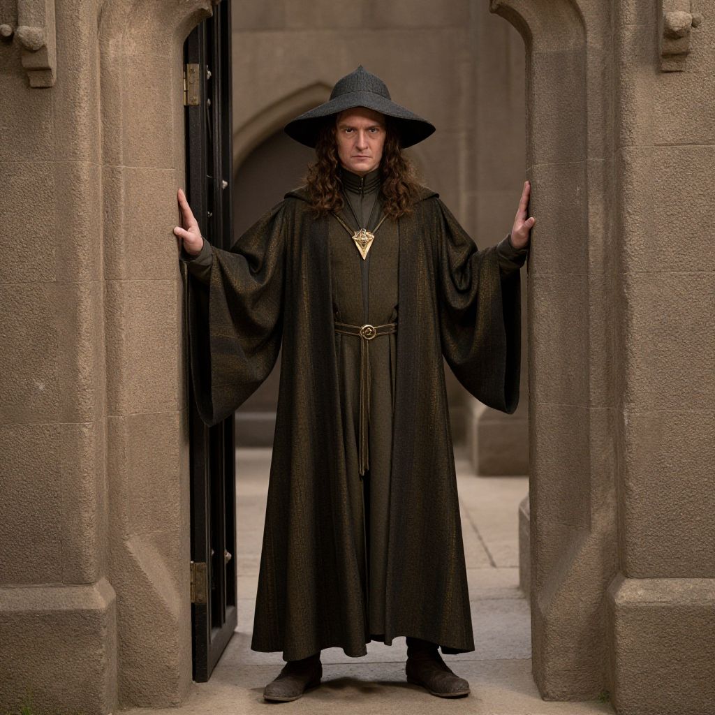 Lord Rings Costume Man, man in a robe and hat standing in a doorway