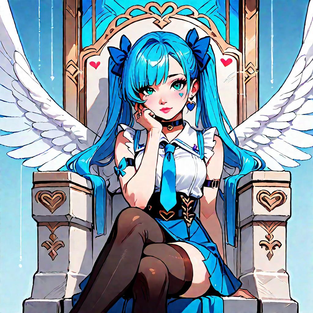 Score_9, score_8_up, score_7_up, score_6_up, score_5_up, score_4_up, source_anime, aaangel, twintails, blue hair, hair bow, blue bow, blue eyes, facial mark, heart earrings, wings, heart, choker, blue necktie, sleeveless shirt, white shirt, arm strap, blue skirt, black thighhighs, throne, sitting, crossed legs, hand on own cheek