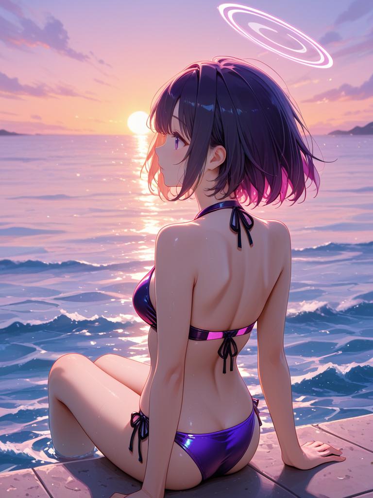 1girl, Neon orange halter neck bikini top, crisscross back design, high-cut neon purple bikini bottom, lightweight polyester blend, bold color blocking, chic and sporty look, great for sunbathing and swimming.