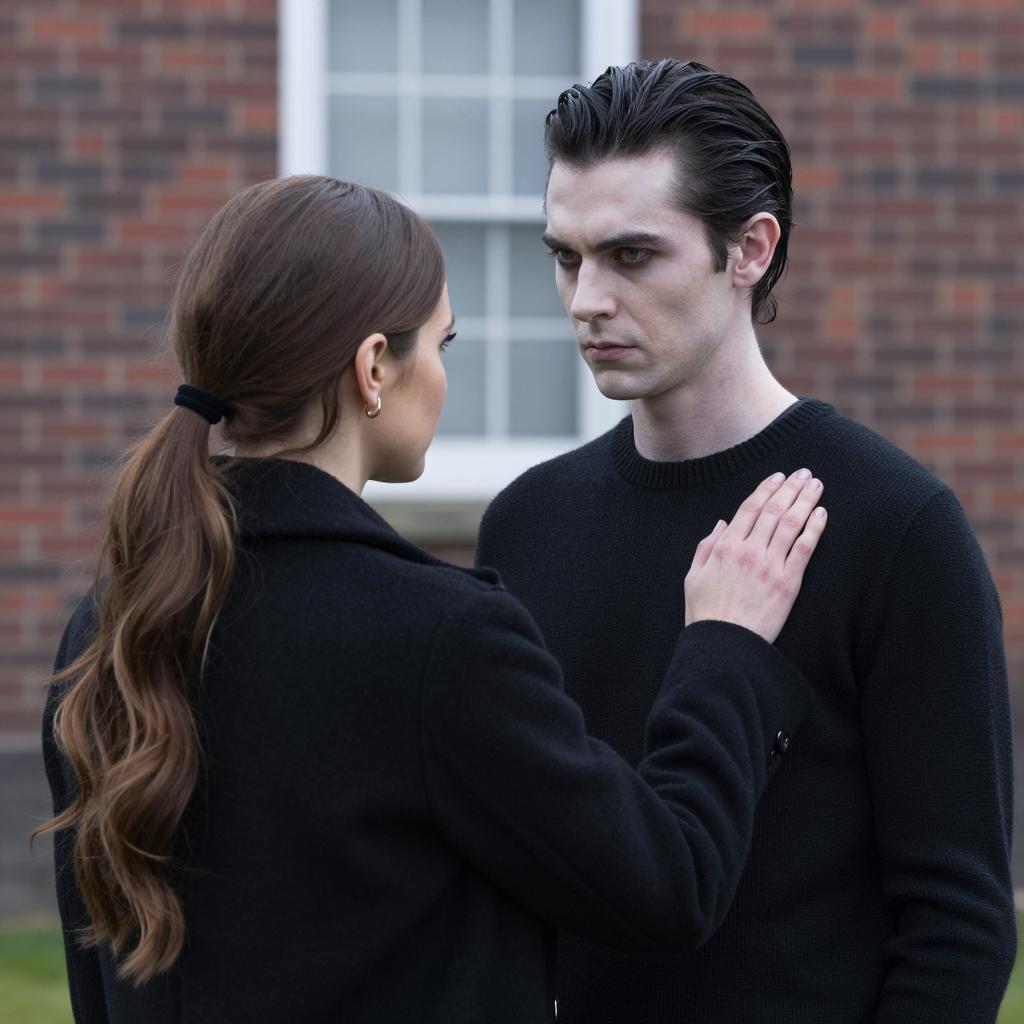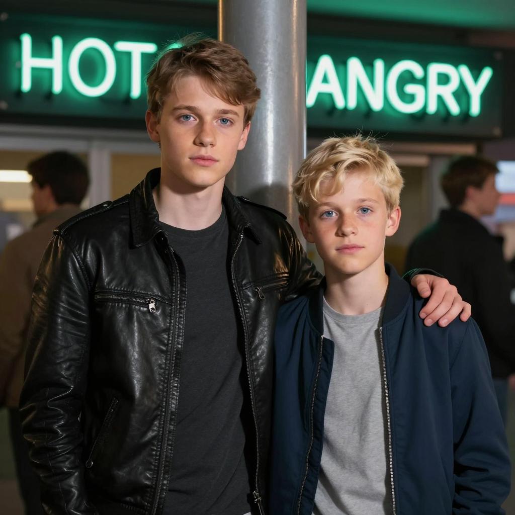 Adult male with short dark hair, pale skin, and intense gaze, wearing a black shirt with metallic patterns and a black jacket, stands behind a silver pillar. Young boy with blond hair, pale skin, and neutral expression, wearing a gray shirt with red trim and a dark jacket, stands in front. Background includes blurred lights and structures. Two people. Adult male's right arm rests on boy's shoulder.