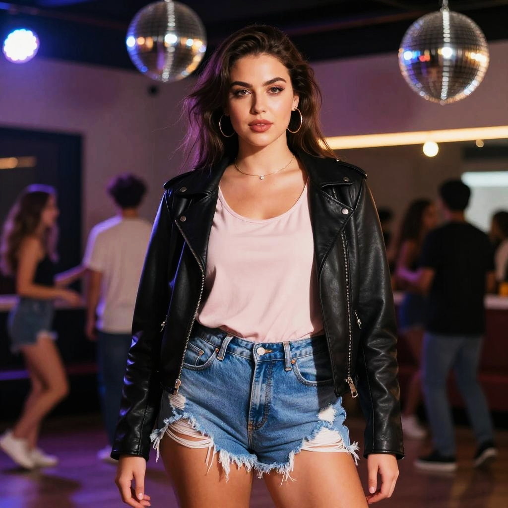 A Curvy woman in casual streetwear, wearing distressed denim shorts, a loose-fitting pale pink tank top, and a black leather biker jacket, stands confidently at a dance hall with disco lights, embodying a vibrant vertical inc visual style. Sexy. Pretty face and beutiful eyes
