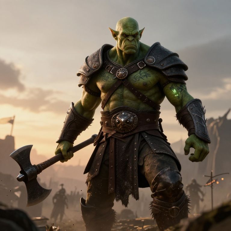 Half orc soldier standing proud on a battlefield at dawn, clad in rugged armor with battle scars, gripping a heavy axe, intense green skin, tribal tattoos glowing faintly, dramatic lighting, epic fantasy atmosphere, detailed textures, dynamic pose.