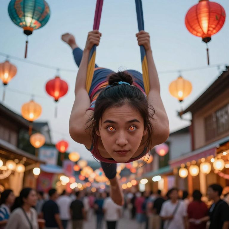 Envision an ultra-realistic portrait of a skilled acrobat in mid-performance amidst the vibrant atmosphere of a bustling street festival. The acrobat's face, a study in contrasts, exudes intense focus and serene calm as if time has paused during their awe-inspiring aerial feat. From an unconventional low angle, we gain insight into her eyes, mirroring the colorful floating lanterns above, while the surrounding crowd appears distant and warped—a captivating blend of reality and fantasy. This unique perspective captures both the acrobat's skill and the dreamlike ambiance.
