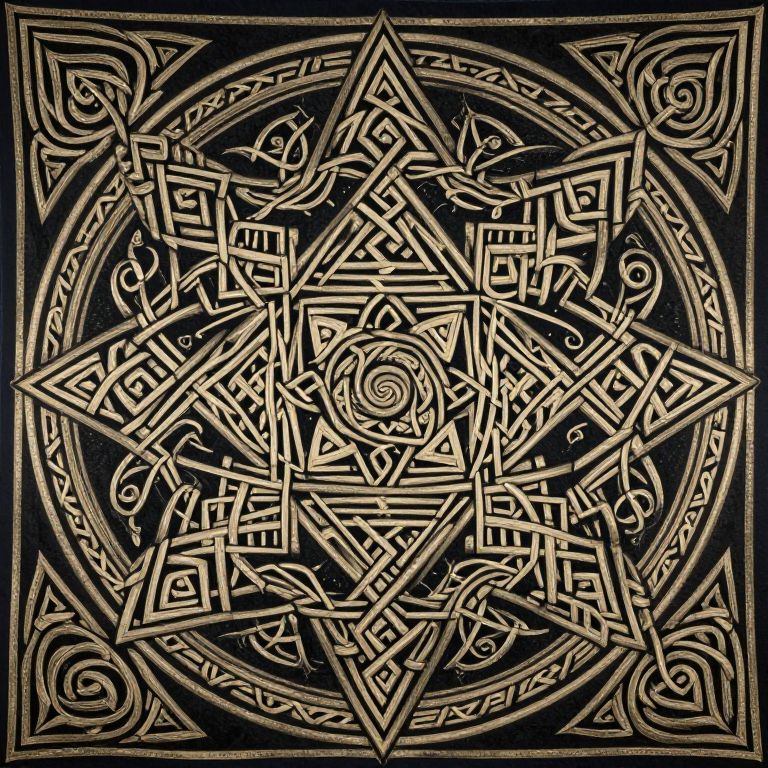 Intricate, black-and-white, Celtic-inspired, geometric mandala with interlocking triangles, circles, and symbols, set against a dark background,