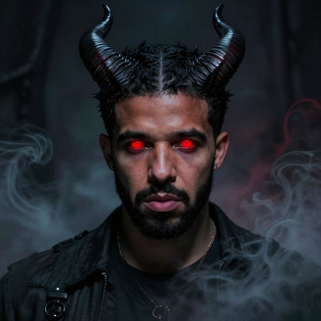 Is Drake demonic? A surreal portrait of Drake with dark, mystical shadows, glowing red eyes, and subtle demonic horns, surrounded by an eerie smoky atmosphere.
