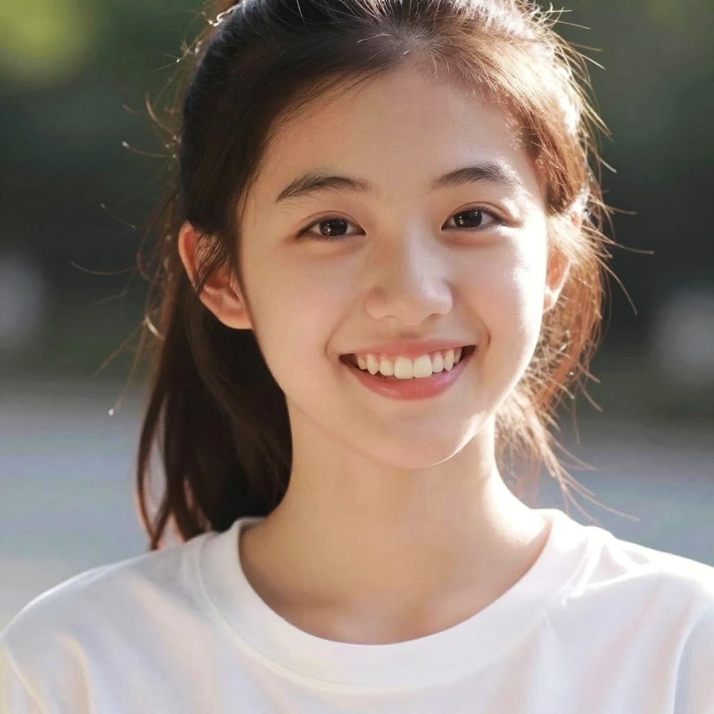 Photograph of a smiling young Asian woman with straight brown hair, wearing a white shirt, sunlight illuminating her face, and a blurred green background.