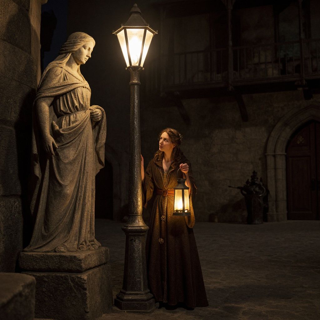 A medieval fantasy city at night, with a woman in robes holding a lantern, standing near a stone statue of an old woman, under a glowing street lamp.