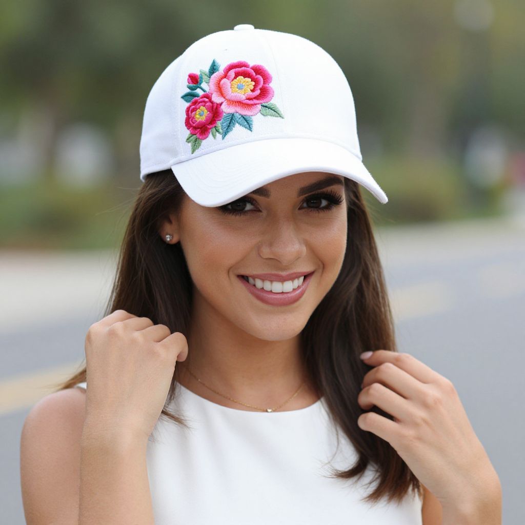 Woman wearing a crisp white baseball cap adorned with vibrant peony embroidery, paired with a sleeveless white top, smiles brightly while gently touching her hair against a blurred outdoor backdrop featuring greenery and pavement.
