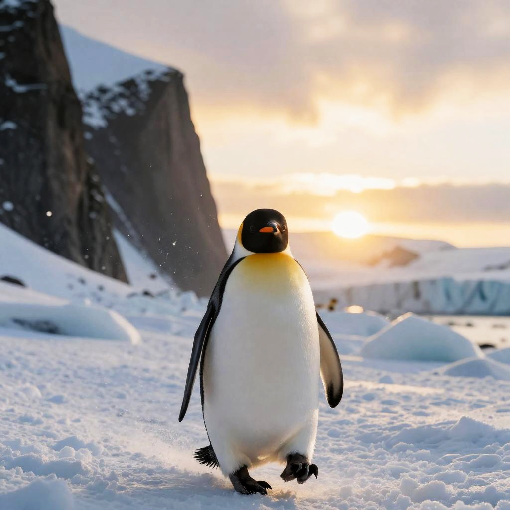 A majestic giraffe standing in the golden grasslands of the African savannah at sunset. The sky is a vivid mix of orange, purple, and yellow hues. Acacia trees are scattered around, and birds fly in the colorful sky. The image captures the natural beauty and wildlife of the African landscape, likely in a national park or reserve.