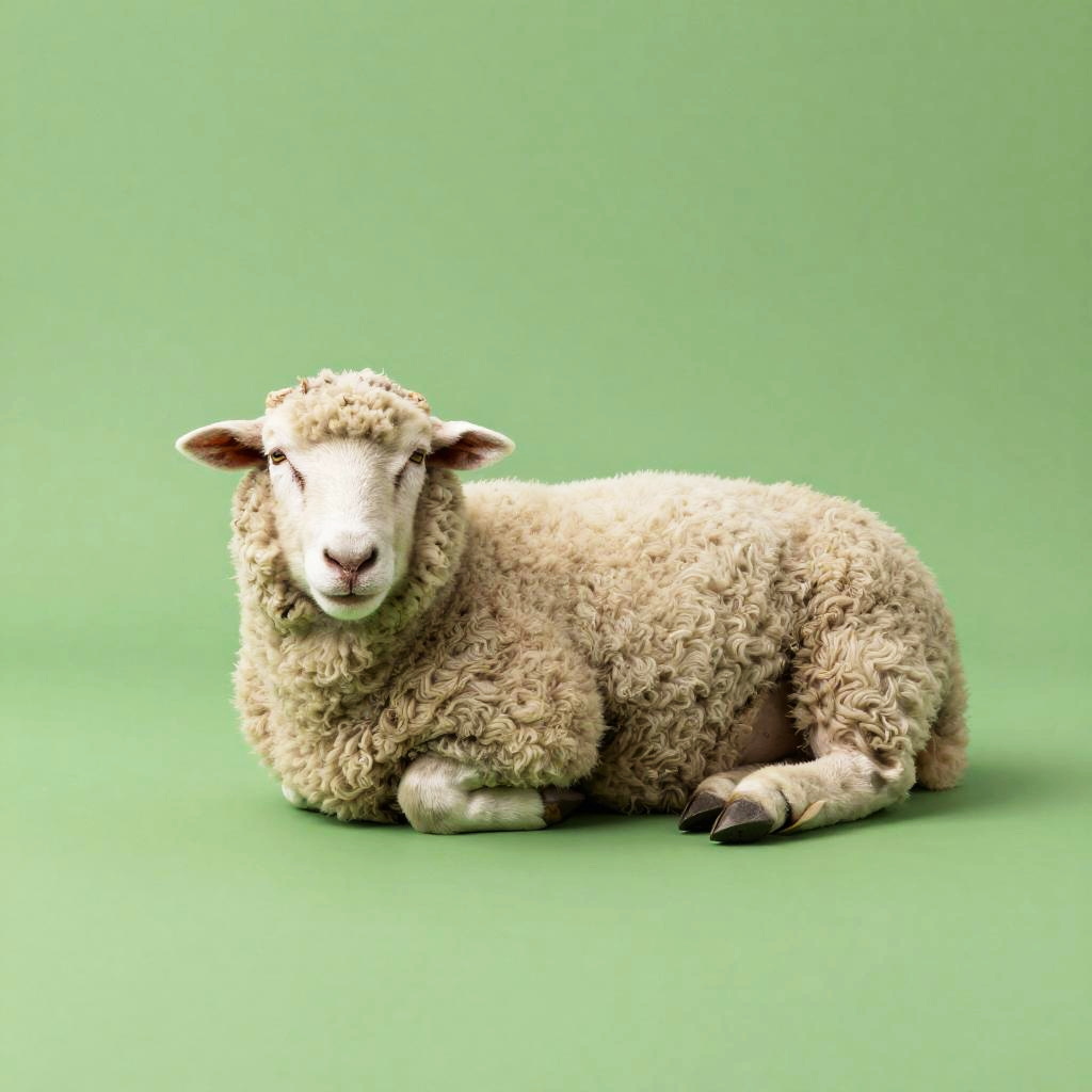 Full body, solo, sheep, matte beige wool with sleepy chocolate eyes, realistic furry texture, closed mouth expression, napping upright, green background