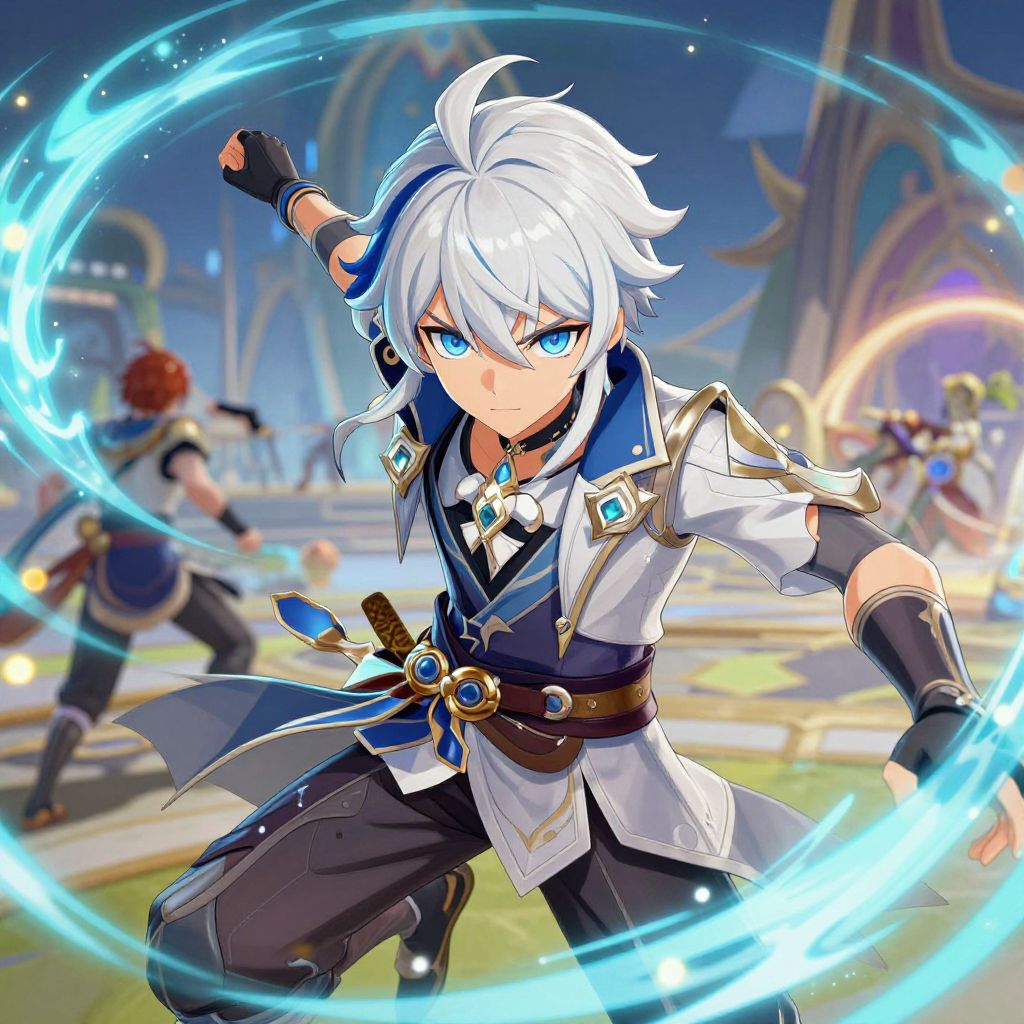 Dynamic scene of a handsome anime boy with white hair and intense blue eyes, mid-action in a fantasy battle arena, swirling magical energy around him, intricate costume design, vibrant colors and sharp contrasts, immersive anime style