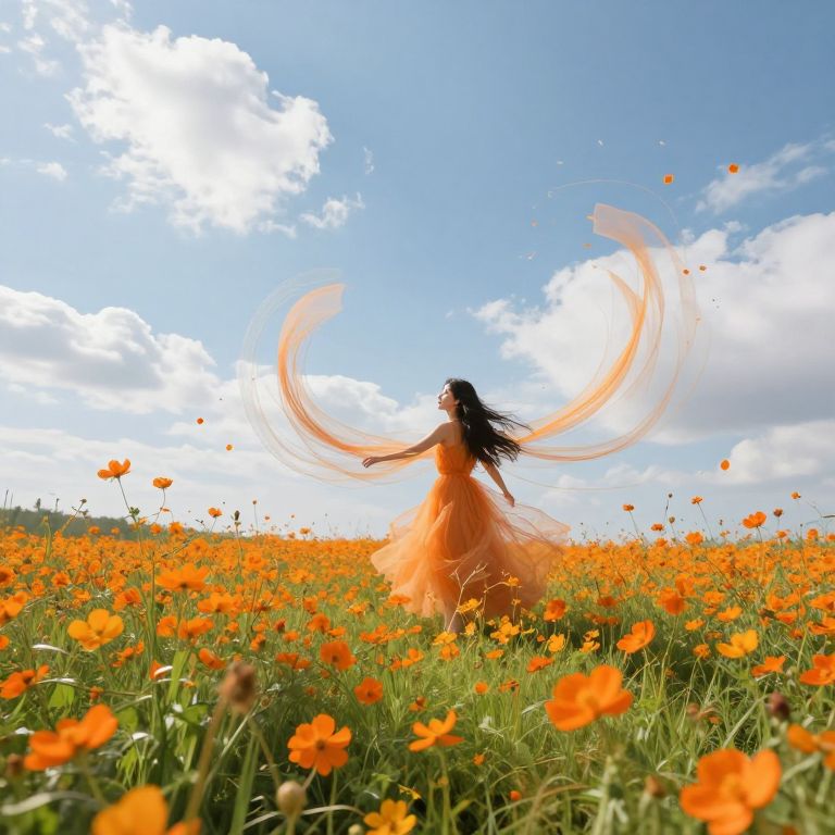 In a meadow where vibrant orange blooms sing their secrets to the sky, swirling melodies dance like ribbons of color, evoking a symphony of freedom and transcendence.
