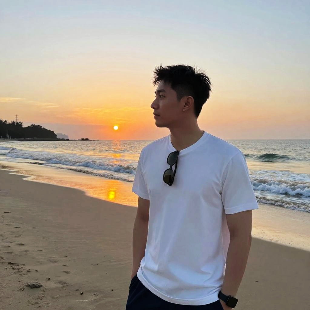 Photograph of a young Asian man with short black hair, wearing a white t-shirt and black pants, standing on a sandy beach at sunset, with