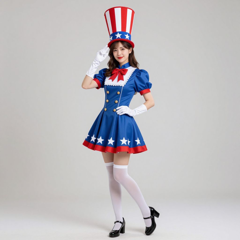 A woman dressed in a festive, patriotic-inspired costume featuring a blue dress with white stars, red and white accents, and gold buttons. She wears a tall, red and white striped top hat with a blue band decorated with white stars, white gloves, thigh-high white stockings, and black shoes, all set against a plain background in a studio-style portrait.