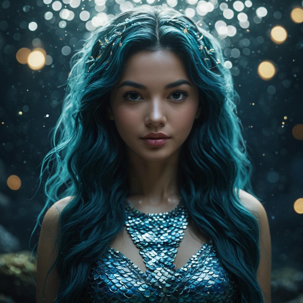 Incredibly realistic portrait of an ethereal mermaid oracle with long teal-blue wavy hair adorned with delicate golden accents. She wears a shimmering scale-like textured top and necklace that resemble fish scales, enhancing the mystical aquatic theme. The image features detailed bump mapping and global illumination effects with a soft bokeh background, rendered using Octane and Unreal Engine 5 for ultra-high resolution and depth.