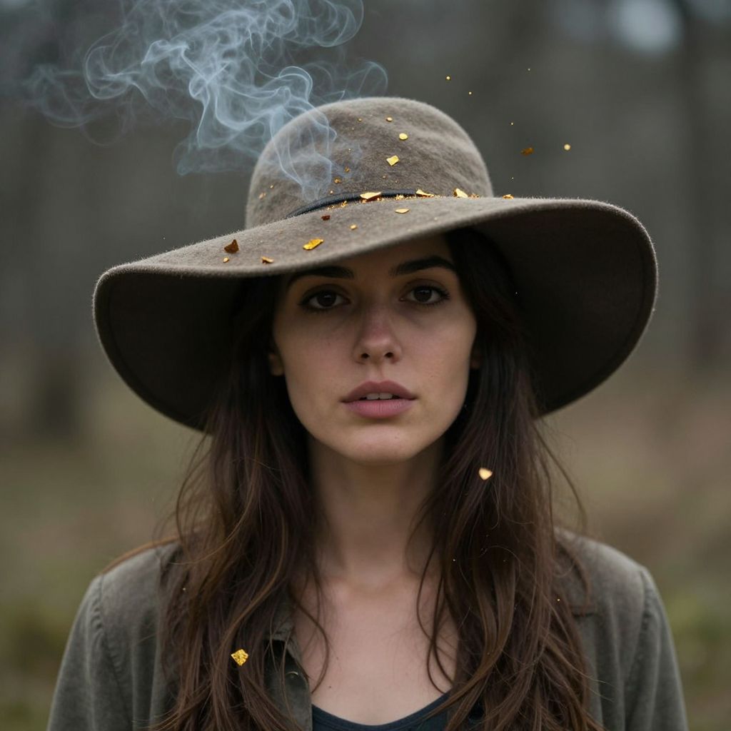 A woman dons a wide-brimmed hat that defies reality, as wisps of smoke and golden fragments seem to emanate from its brim, suggesting a tangible release of memories or moments from her past.