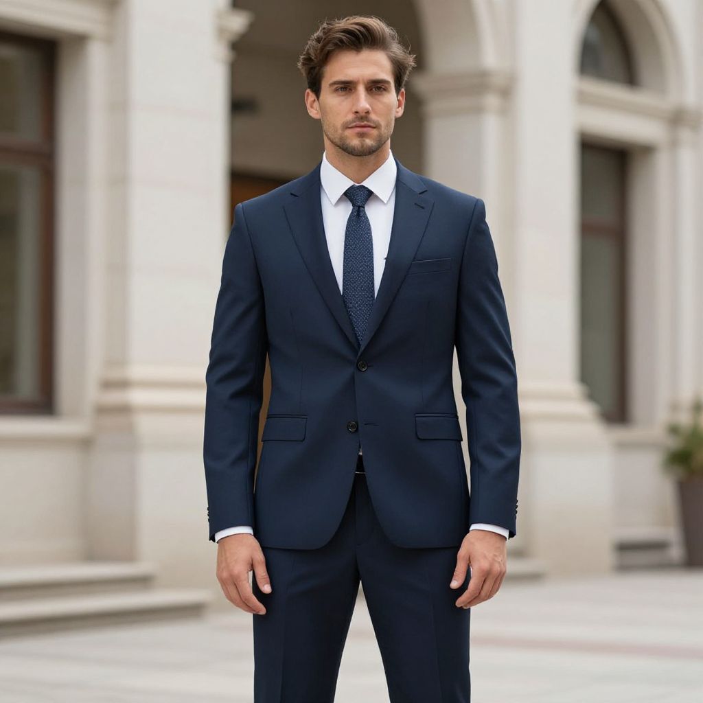 Upscale Fashionable Attire Costume, man in a suit and tie standing in front of a building