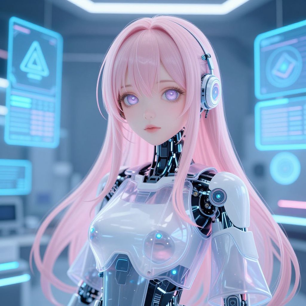 This is a digital CGI image of a futuristic anime-style female cyborg with long, pastel pink hair and glowing purple eyes. She wears a white and black, high-tech suit with glowing blue accents and a headset with circular earpieces. The background is a blurred, high-tech laboratory with blue neon signs and screens. Her expression is calm, and her skin is fair. The image has a sleek, sci-fi aesthetic with a focus on futuristic technology and a soft, ethereal color palette.