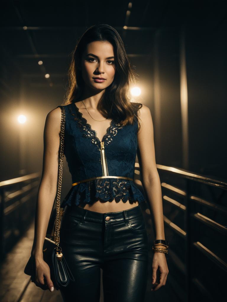 Elegant Woman in Navy Lace Top and Black Faux Leather Pants