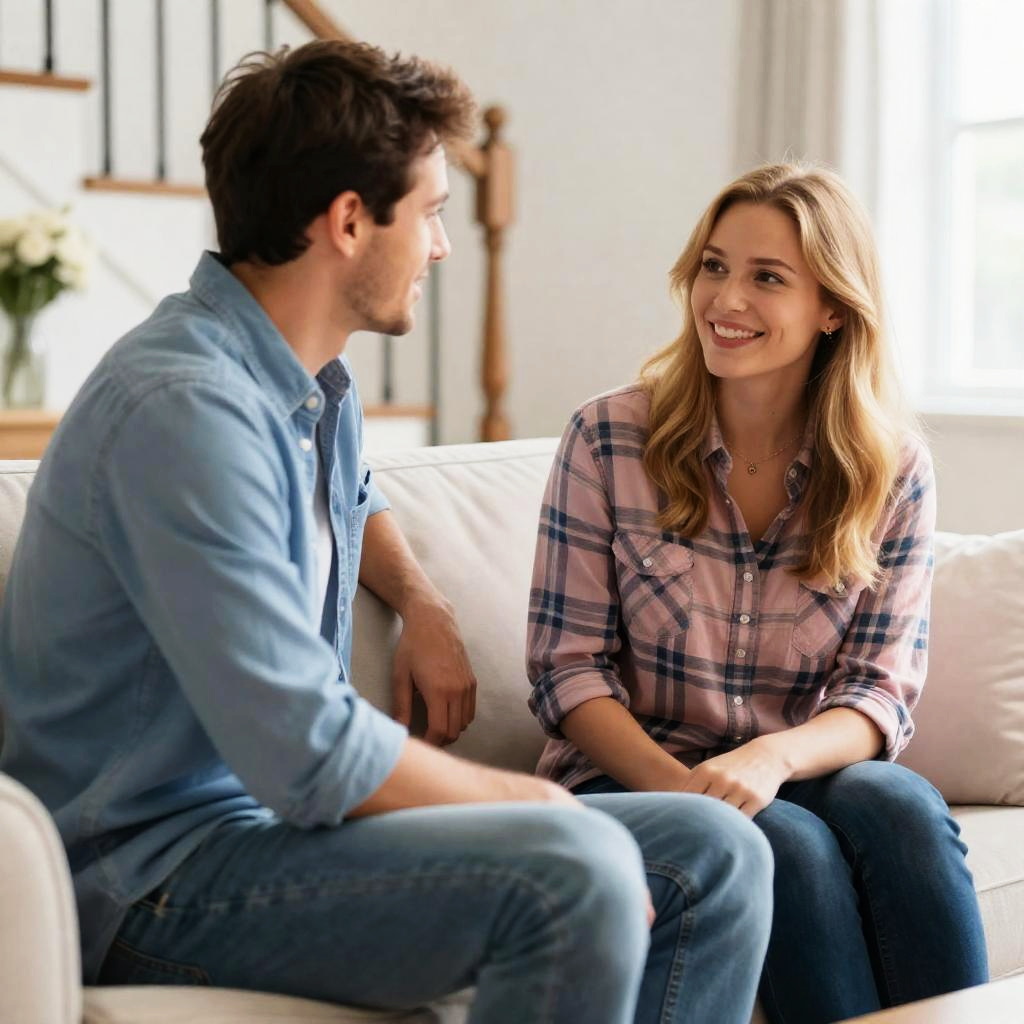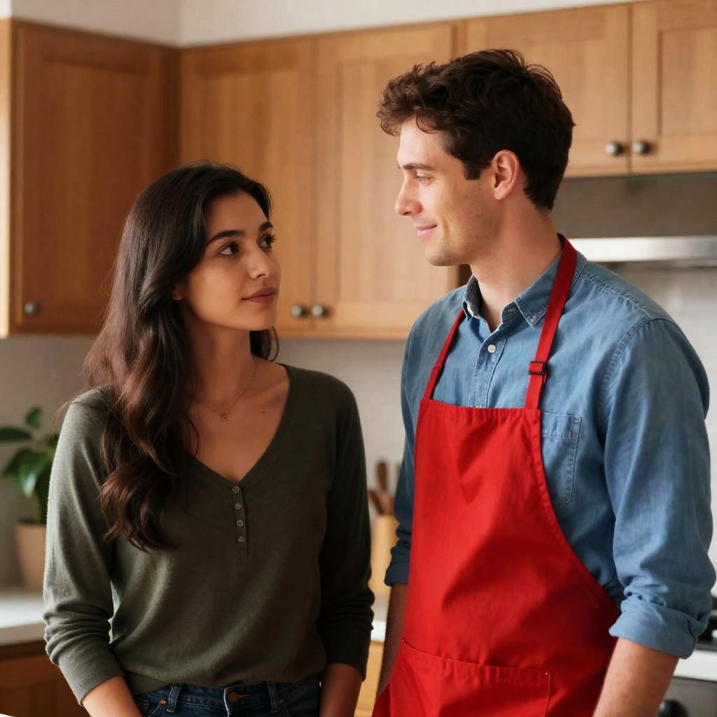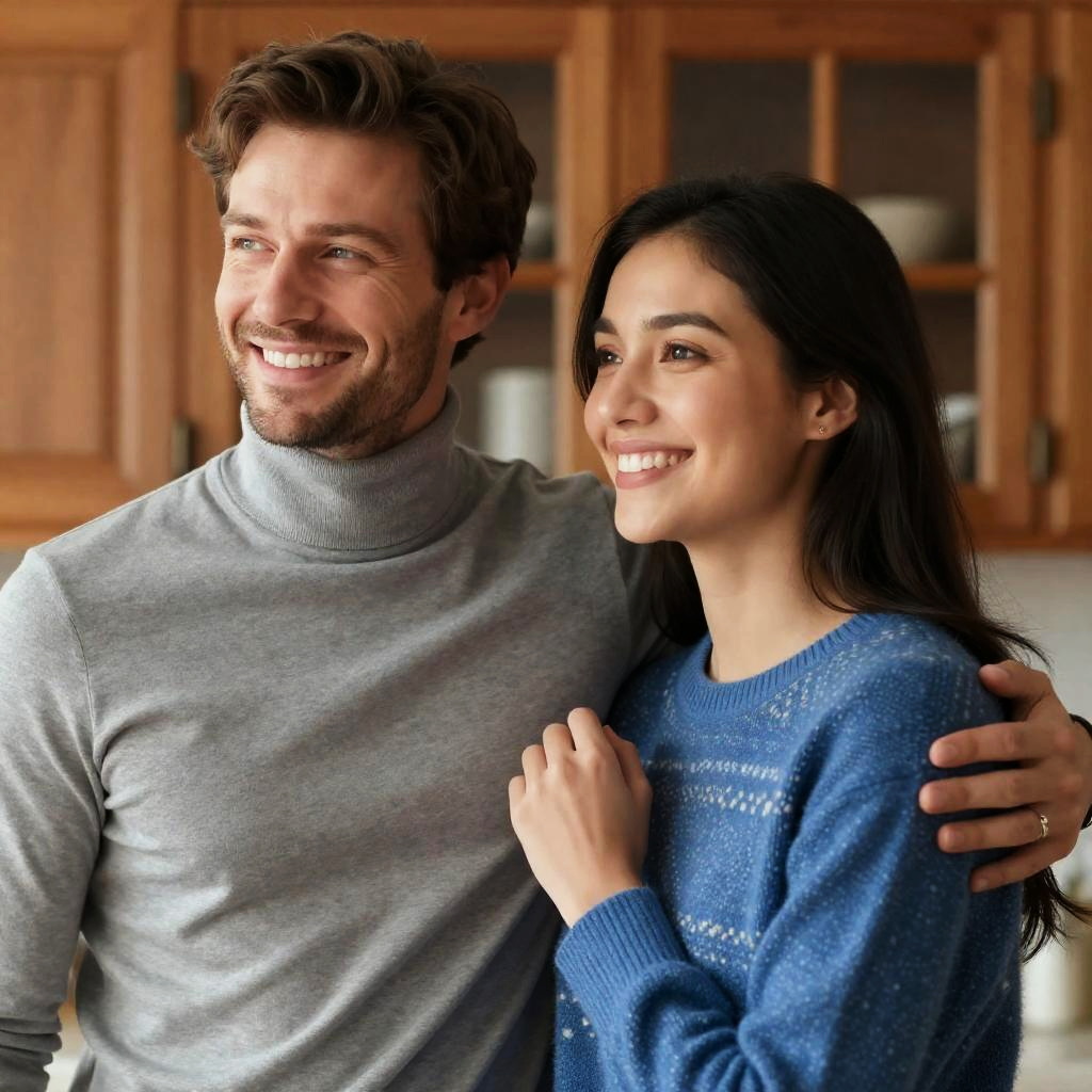 Photograph of a smiling man and woman. Man with short brown hair, light stubble, gray turtleneck, facing left. Woman with long dark hair, light makeup, blue patterned sweater, hands clasped, facing right. Indoor setting with wooden cabinets and glass windows in background. Man's arm around woman's shoulders. Both smiling warmly.