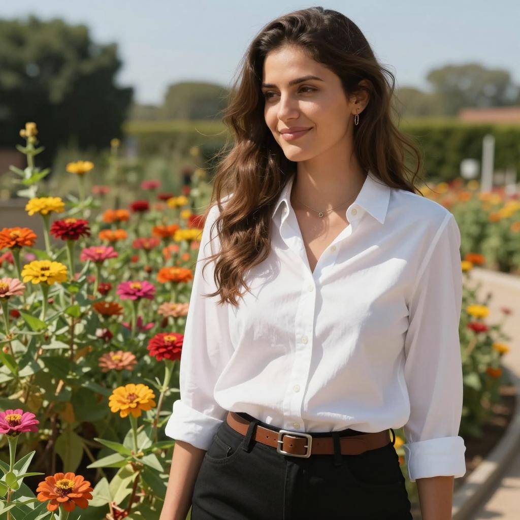 High end western wear, photorealistic, full-body shot, young woman standing in vibrant flower garden, summer day, clear sunlight, blue button-up shirt with chest pocket, light blue and white pattern, high-waisted beige pants with brown belt, long brown hair, natural makeup, hands in pants pockets, blurred colorful flowers in background, green foliage, background building with circular windows, relaxed pose, attractive, confident, casual style, realistic ure, detailed clothing, outdoor setting