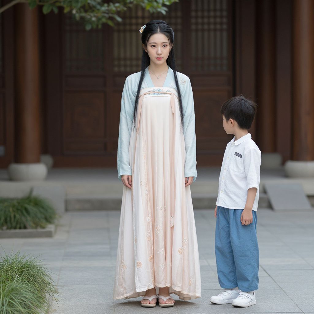 Photograph of an East Asian woman and young boy standing outdoors in front of a traditional wooden building. The woman has long black hair with white hairpins, wearing a white long-sleeve top with a light pink, flowing, ankle-length skirt. The boy, with short black hair, wears a white t-shirt and loose blue pants, paired with white sneakers. The woman stands facing the camera, while the boy looks at her from the side. The background features a stone-paved courtyard with greenery and dark wooden doors. The woman's expression is neutral, and the overall scene exudes a traditional, serene atmosphere.