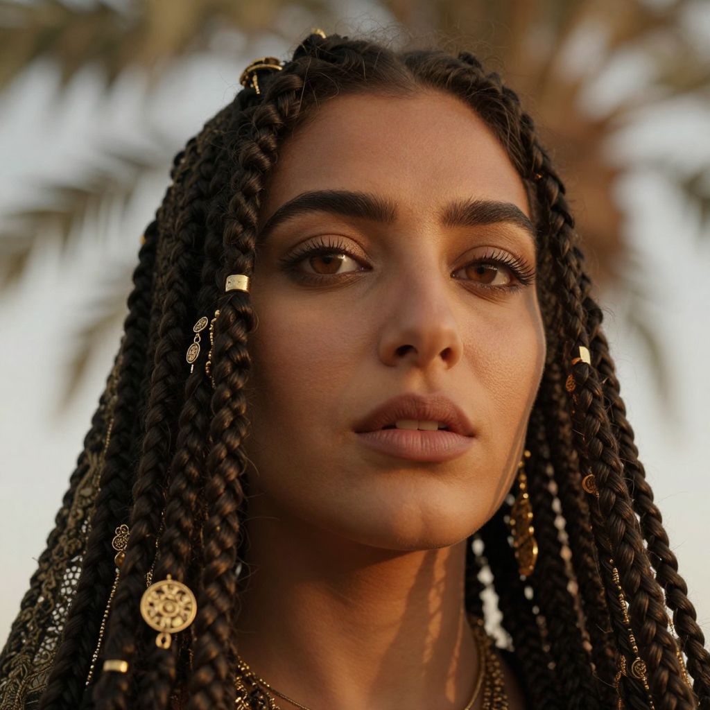 Envision a portrait of a Middle Eastern woman with an enigmatic expression and piercing brown eyes, her face adorned by thick dark braids embellished with delicate gold accessories. Captured from a unique low-angle perspective, the image showcases her intricate features and soft olive skin illuminated by warm golden hour light filtering through a palm tree. This captivating portrait evokes a complex blend of mystery, strength, and serenity, transcending cultural boundaries and inviting viewers to uncover the untold stories hidden within her eyes.