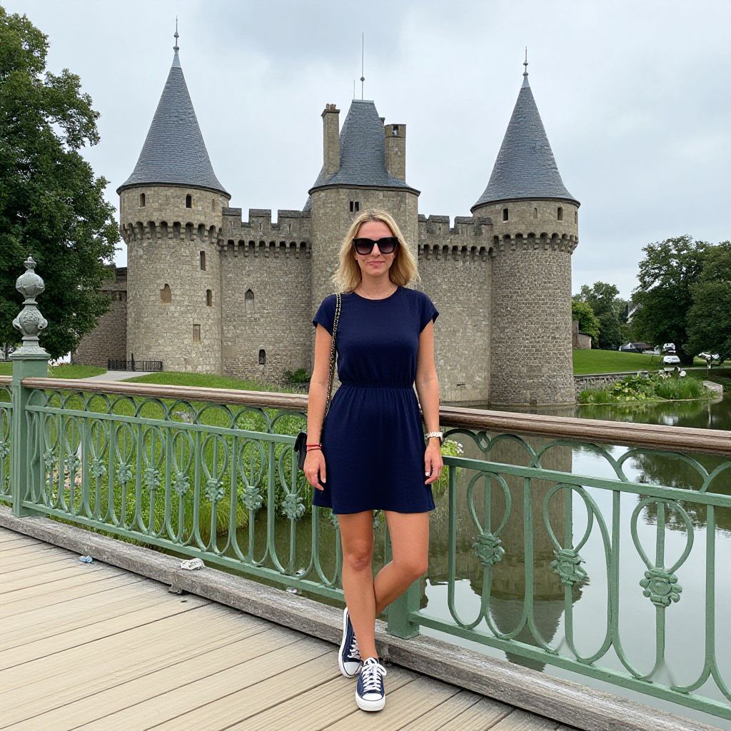 Woman standing on a wooden bridge with ornate green railings, wearing a navy blue dress, sunglasses, and sneakers, with three conical-roofed towers and a moat visible in the background, suggesting a European castle setting.