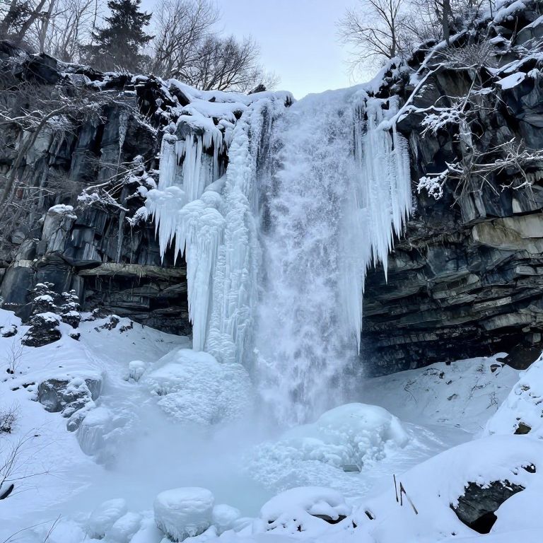Where nature's eternal cascade meets the cold embrace of winter, a frozen waterfall stands as a silent sentinel, embodying the transient beauty of time and the enduring power of nature's resilience.