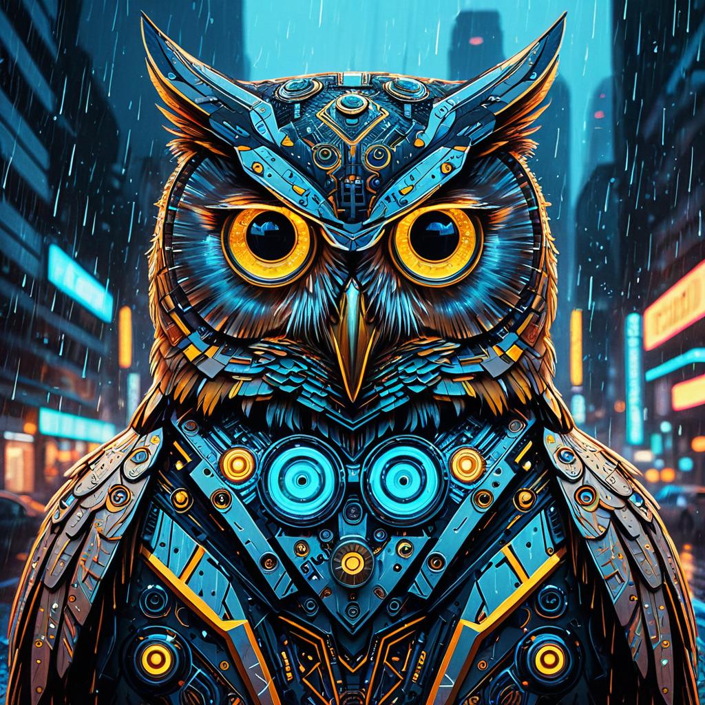 Digital painting of a four-eyed cyberpunk owl automaton featuring intricate metallic filigree and luminous circuitry. The owl is set against a neon-lit, rain-soaked cityscape at twilight, highlighting sharp, smooth details. This concept art showcases futuristic cybernetic design with a blend of organic owl features and mechanical elements.