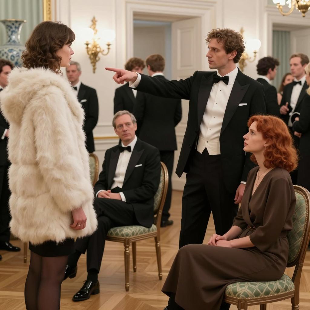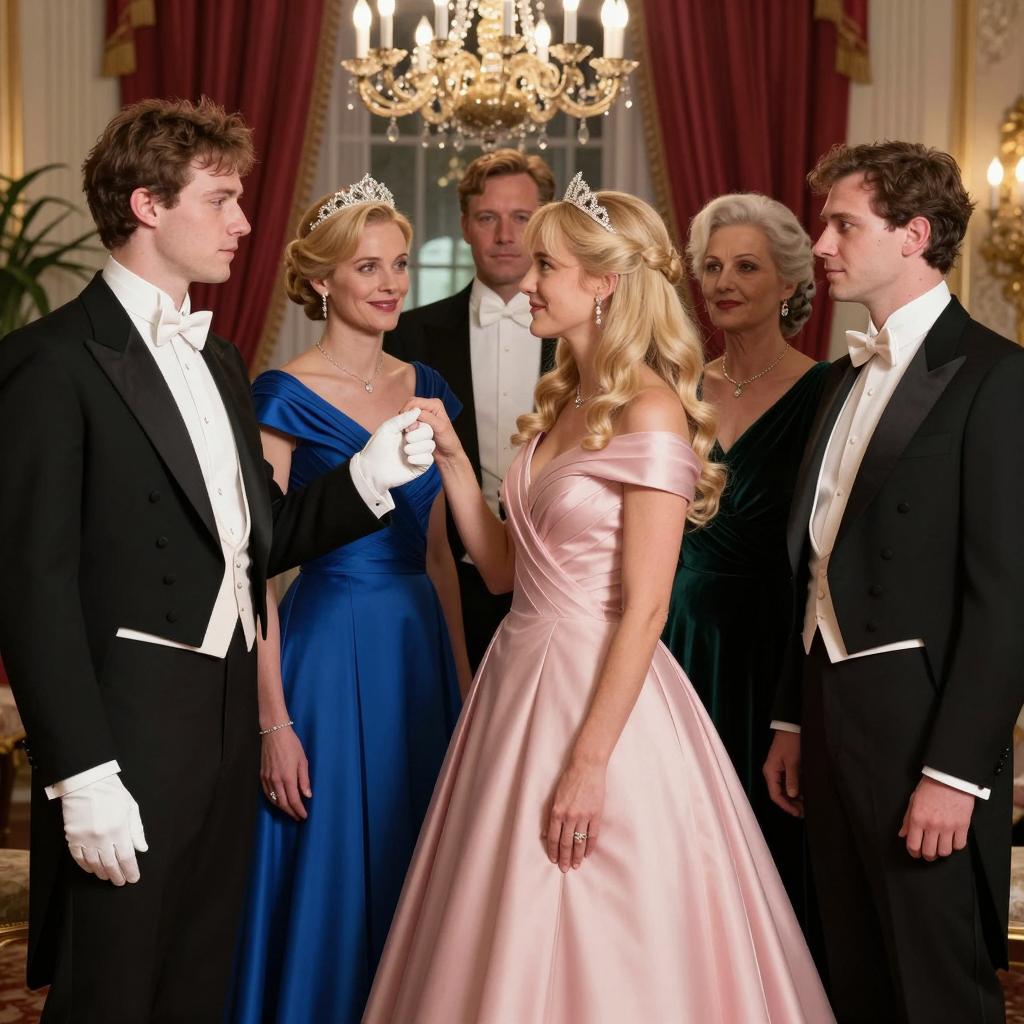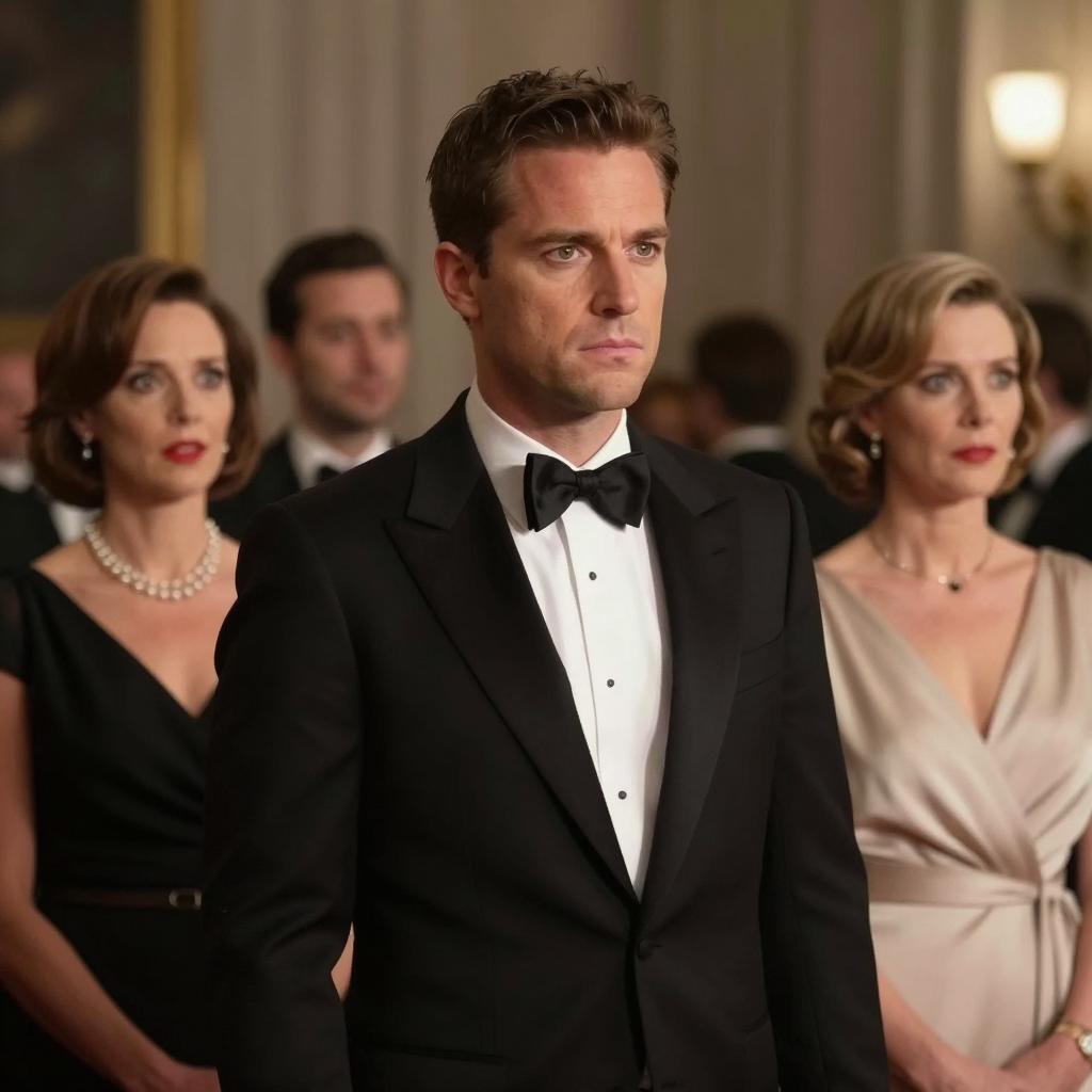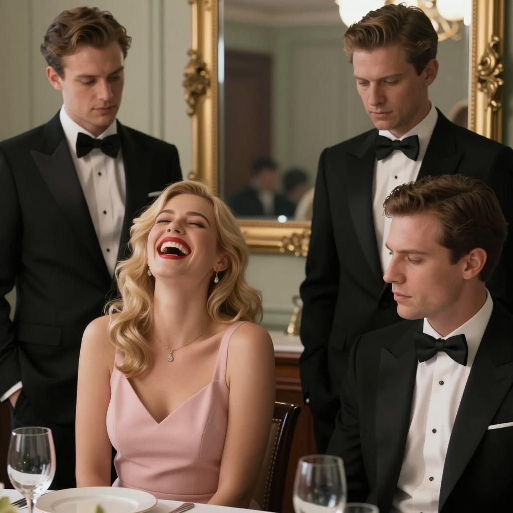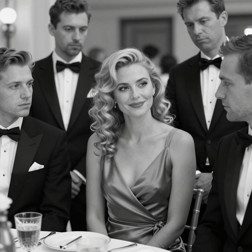 Photograph of a formal dinner party. A blonde woman in a white sleeveless dress sits at a table with a white man in a white tuxedo, a black man in a black tuxedo, and an older man in a black tuxedo. The table has a green tablecloth, floral arrangement, and champagne glasses. Other people in formal attire are in the background. The woman looks surprised, while the men have neutral expressions.
