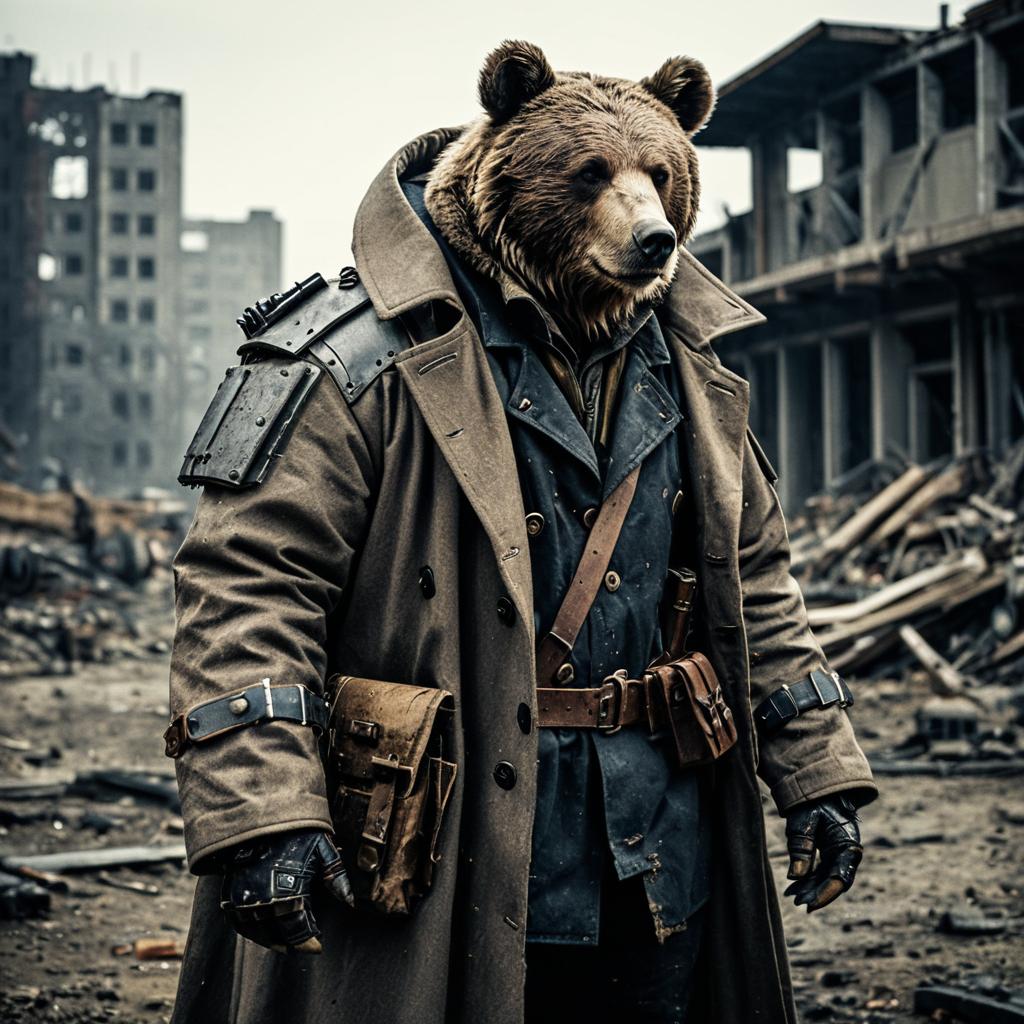 A digitally created image of a post-apocalyptic bear hybrid creature with a stocky build wearing a layered trench coat with armor and utility belts. The bear stands in a ruined urban environment with destroyed buildings and debris in the background, embodying a rugged and dystopian aesthetic.