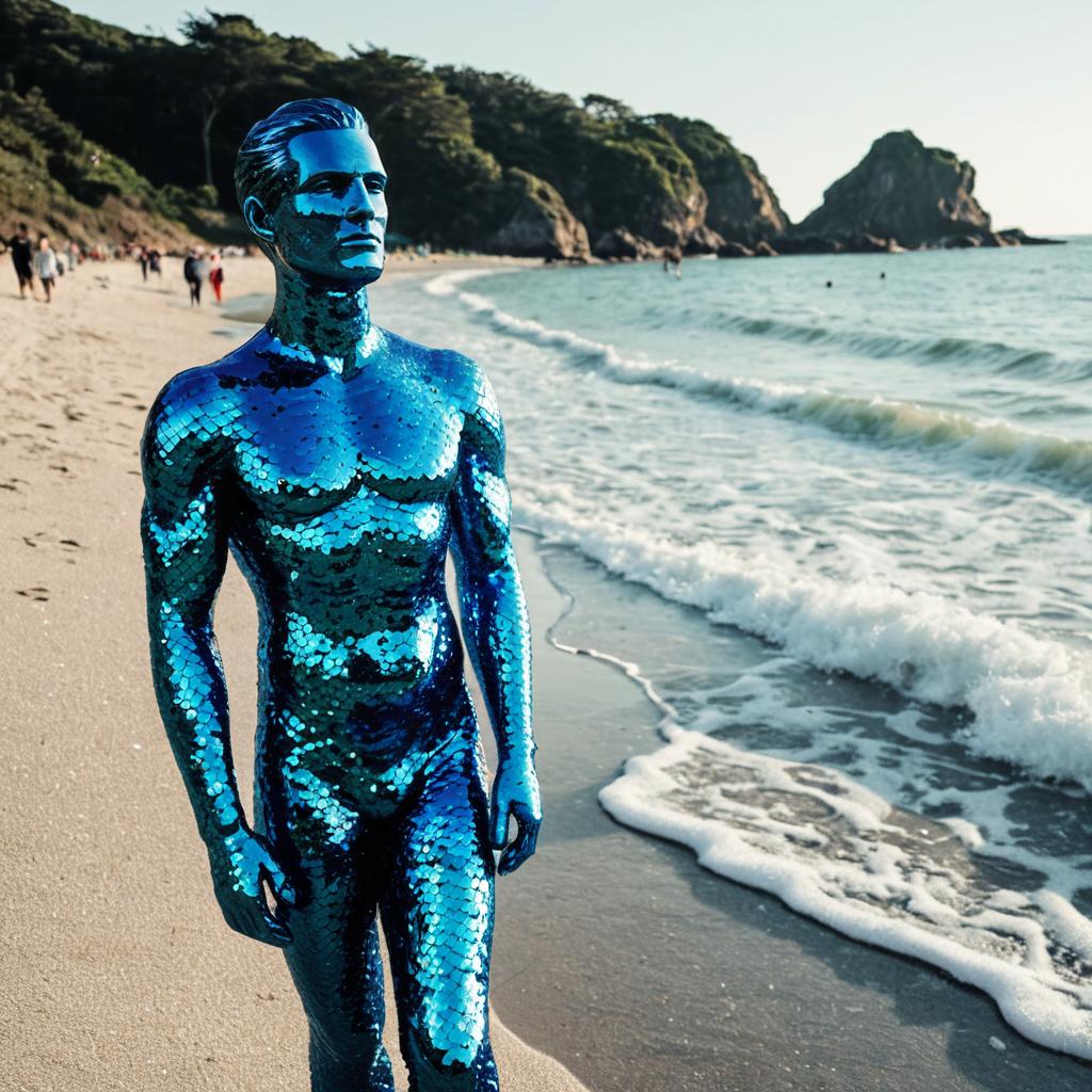 Mermaid made of blue glass sticked together and has come to life. The sugar now looks like a real man and is 1.6 meters tall, very tall. The sugar man has an ultra-realistic face. The sugar man is standing next to a beach shore and suspiciously eyes the beach shore. The sugar glitters beautifully in the sunlight. Real-Life photo shot, full-Body photo, 8K UHD, many details, Award-winning.