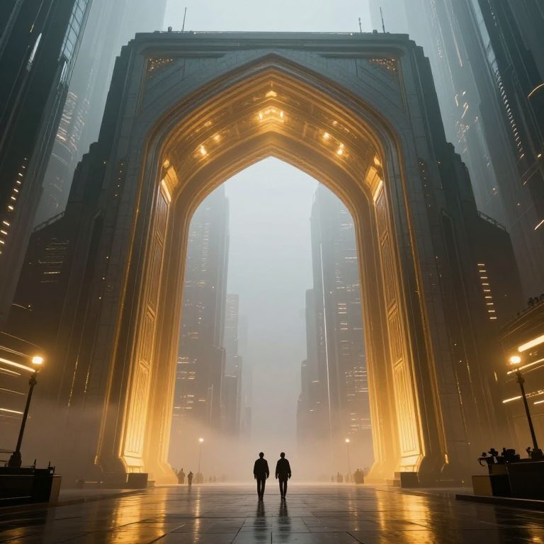 Colossal archways stand majestically in the heart of a misty, futuristic cityscape, illuminated by golden lights that cast ethereal glows above and below, as two figures walk toward the distant horizon framed by towering structures.