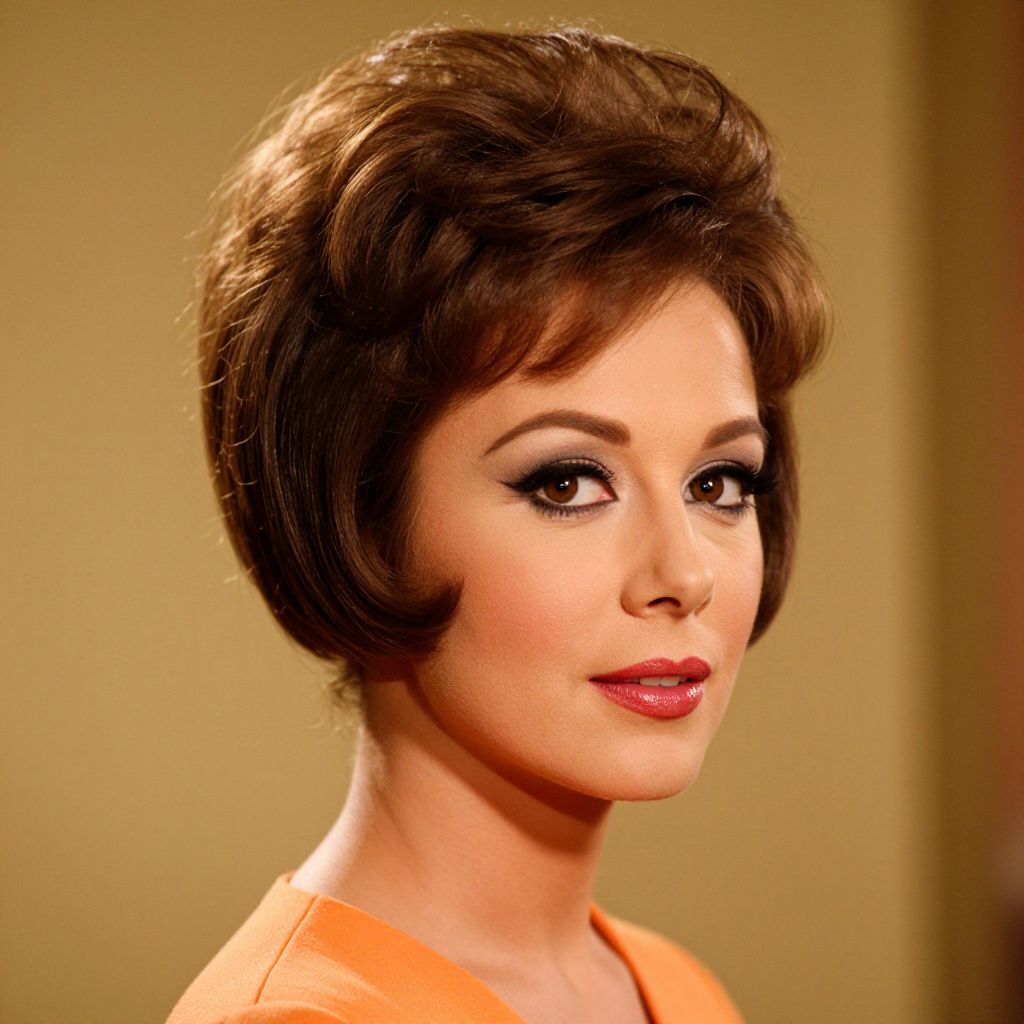 60's bouffant beehive hair styled elegantly on a retro woman, vibrant colors, soft lighting, vintage fashion outfit with bold makeup, high detail, cinematic portrait, 1960s mod influence, smooth texture, warm tones