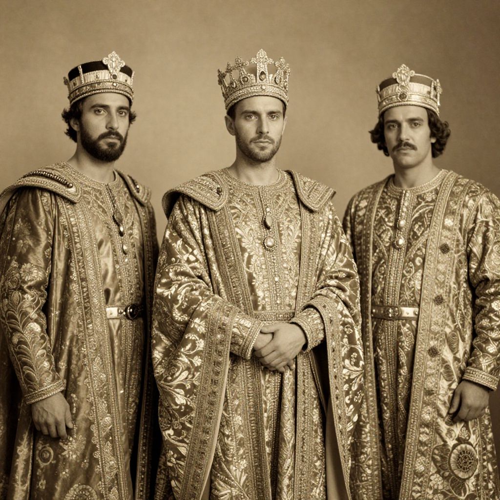 [[man,three kings images]]Regal, majestic scene, three kings stand together, dressed in ornate, golden embroidered robes, intricate patterns adorn their attire, rich fabrics, velvet, silk, and satin, gleaming in soft, warm light, antique daguerreotype style, fine details, sharp focus, sepia tone, nostalgic feel. Man has masculine face and piercing eyes