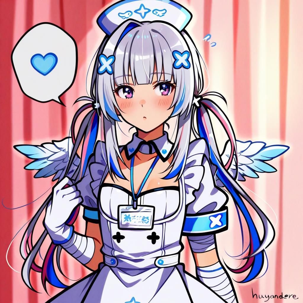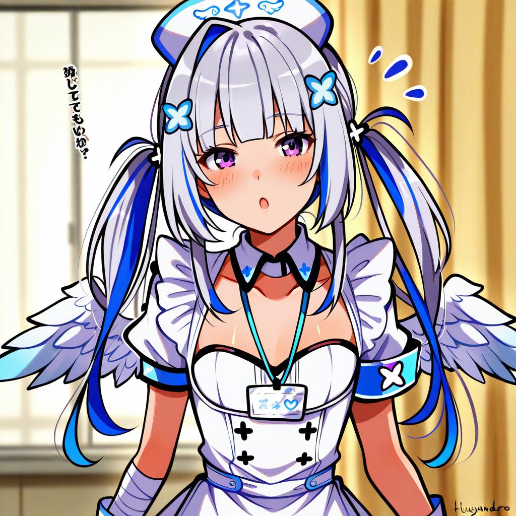 Amane kanata (nurse), hololive, 1girl, angel wings, angel wings, purple eyes, blue hair, grey hair, colored inner hair, single hair intake, official alternate hairstyle, streaked hair, official alternate hair length, long hair, pink hair, x hair ornament, twintails, blunt bangs, small breasts, flat chest, nurse cap, white gloves, white dress, white apron, detached collar, puffy short sleeves, virtual youtuber, virtual youtuber, feathered wings, feathered wings, nurse, nurse, bandaged arm, id card, armband, by artist huyandere, illustrious
