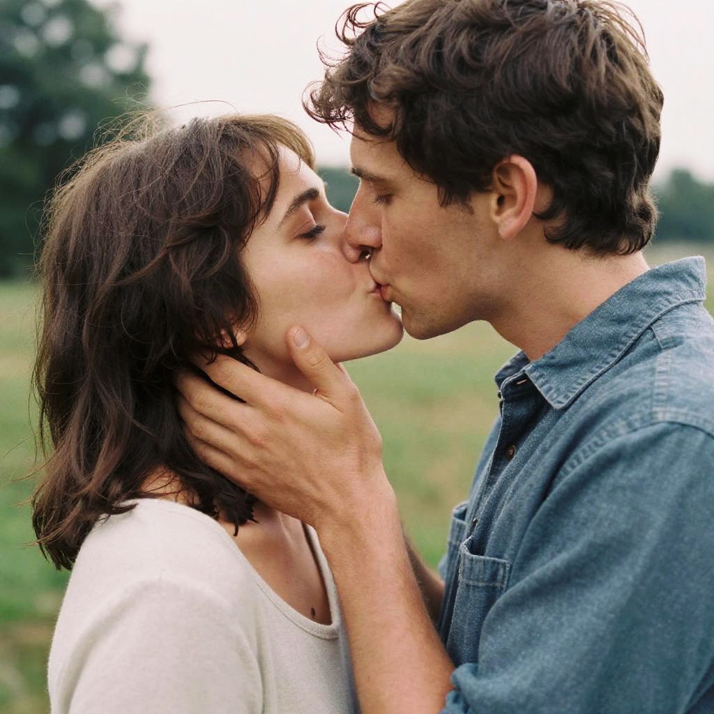 Photograph of a young couple kissing outdoors in a grassy field. The woman, with shoulder-length brown hair and fair skin, wears a white sweater. The man, with curly brown hair and fair skin, wears a blue denim shirt. He gently holds her face with his right hand, his fingers gently cradling her chin. The background is slightly blurred, featuring greenery and a cloudy sky. Their eyes are closed, and their lips are touching softly. The image conveys a sense of intimacy and tenderness.