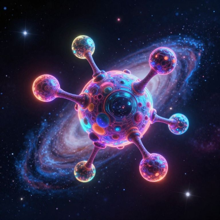 CGI digital artwork depicting a glowing, neon-colored molecular structure floating in outer space. The spherical central body is adorned with circular patterns and is connected to six smaller, similarly glowing spheres by thin, bright neon-blue rods. The background features a swirling, multicolored galaxy with shades of blue, purple, and white, set against a dark, star-speckled cosmos. The entire image has a futuristic, sci-fi aesthetic, with vibrant, luminous colors and a high-contrast, detailed texture. The molecular structure is centered, dominating the frame, while the galaxy provides a contrasting, ethereal backdrop.