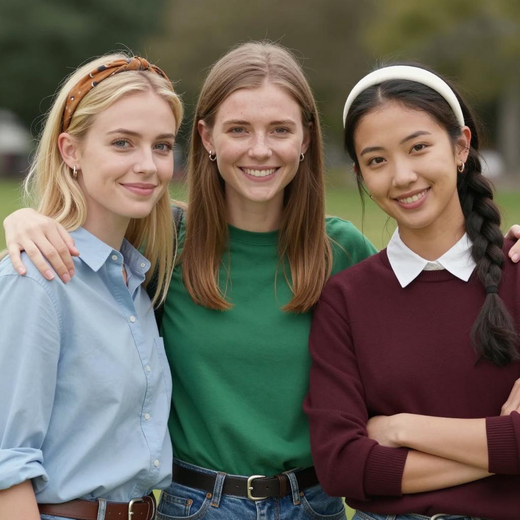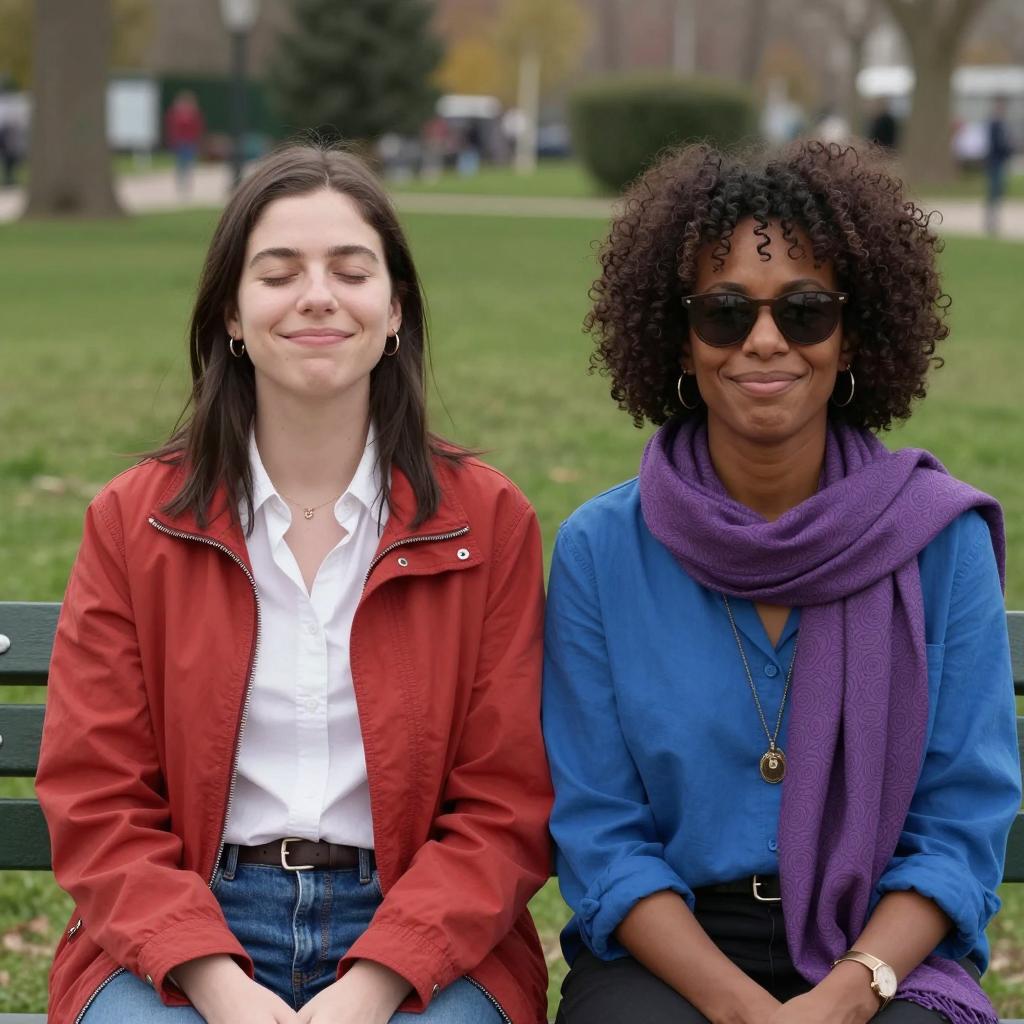 Two women sitting on a green bench in a park. The woman on the left has black hair, red jacket, white shirt, smiling with eyes closed. The woman on the right has dark skin, curly hair, sunglasses, purple patterned scarf, blue shirt, necklace, smiling. Grass and trees in the background.