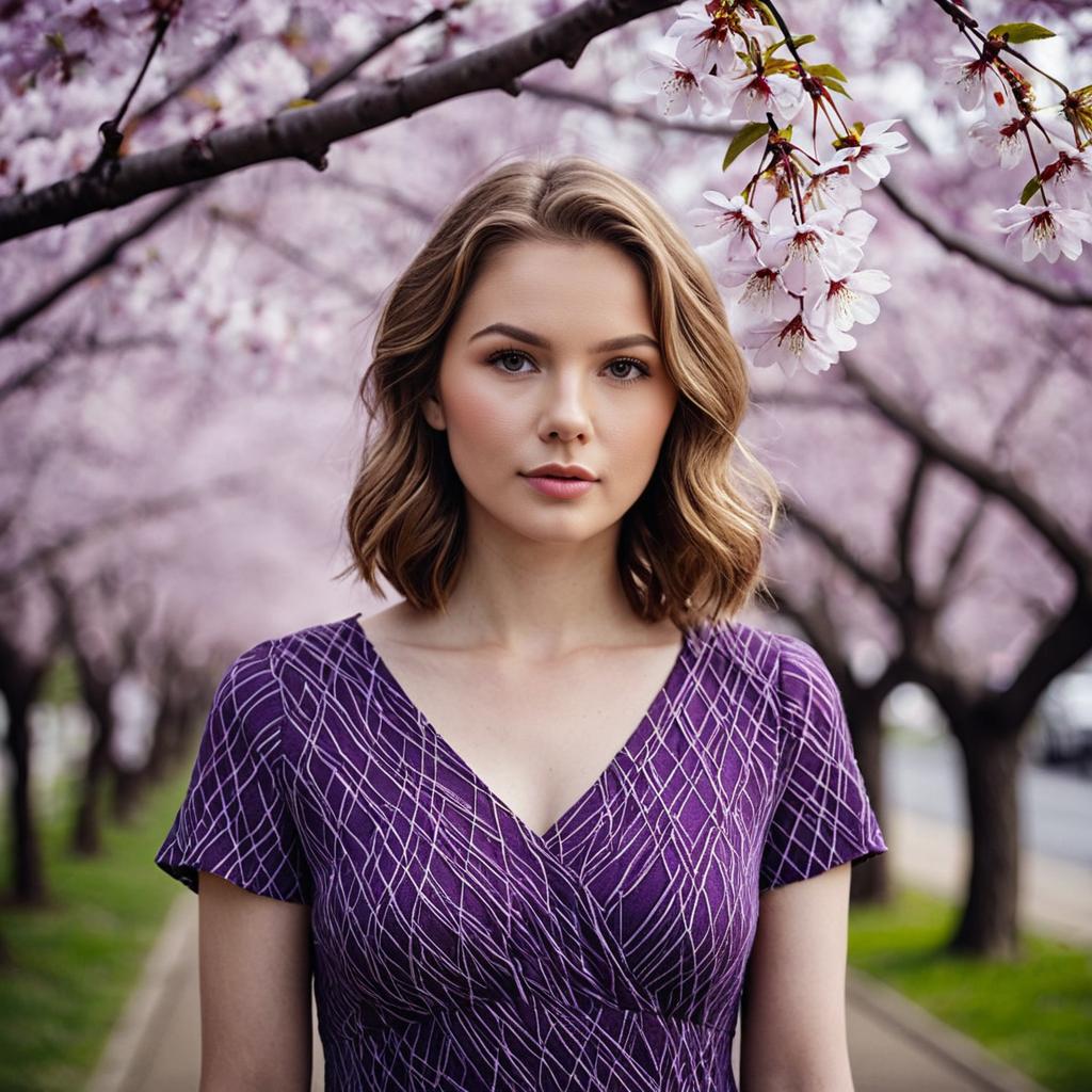 Tangled purple dress, photorealistic, portrait of young woman, standing, front view, wearing purple dress with V-neck and crisscross pattern, soft fabric, short sleeves, light brown wavy hair, blue eyes, fair skin, serious expression, background of purple cherry blossoms, blurred trees, daytime, natural light, realistic ures, detailed clothing, realistic skin tones, serene atmosphere