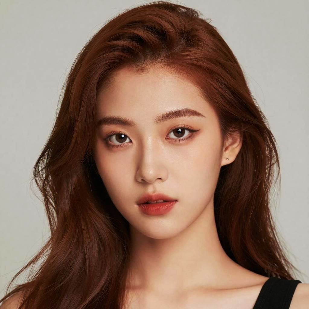 Photorealistic portrait of an Asian woman with long, brown hair, fair skin, and subtle makeup, wearing a black top, against a plain light