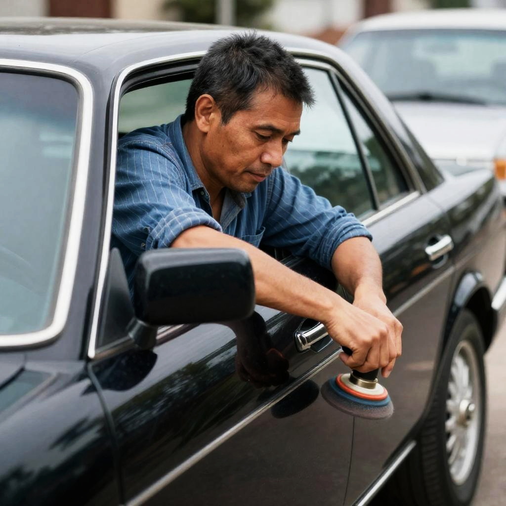 Photograph of a middle-aged man with short dark hair, wearing a blue striped shirt, leaning out of a black classic car's driver's side window, using a metal polishing tool on the car's door. Parked on a street with other cars in the background. He has a focused expression.