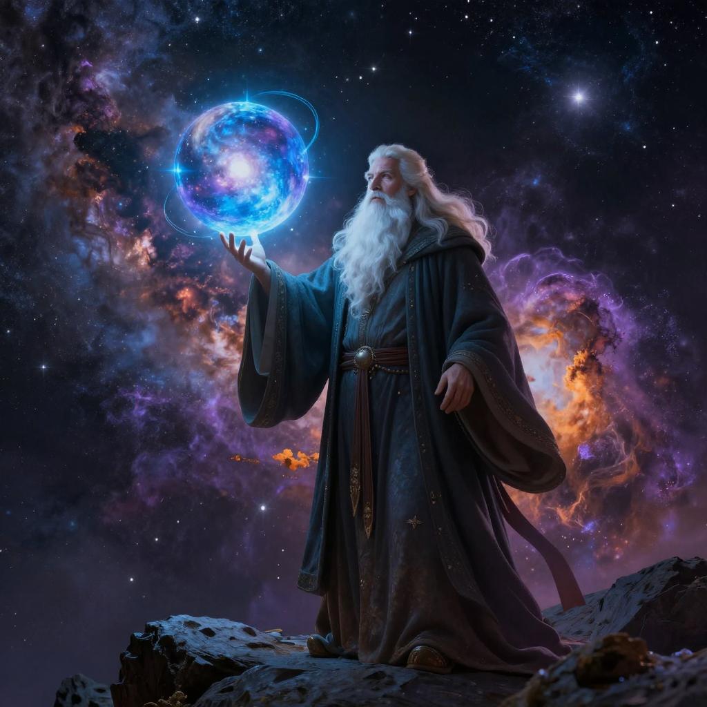 Illustration of an old wizard with long white beard and flowing robes standing on rocky terrain, conjuring a glowing blue magical galaxy orb in space. Purple and orange nebula clouds fill the cosmic background under a starry sky, conveying a scene of mystical cosmic power.