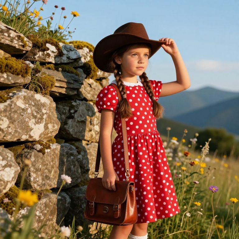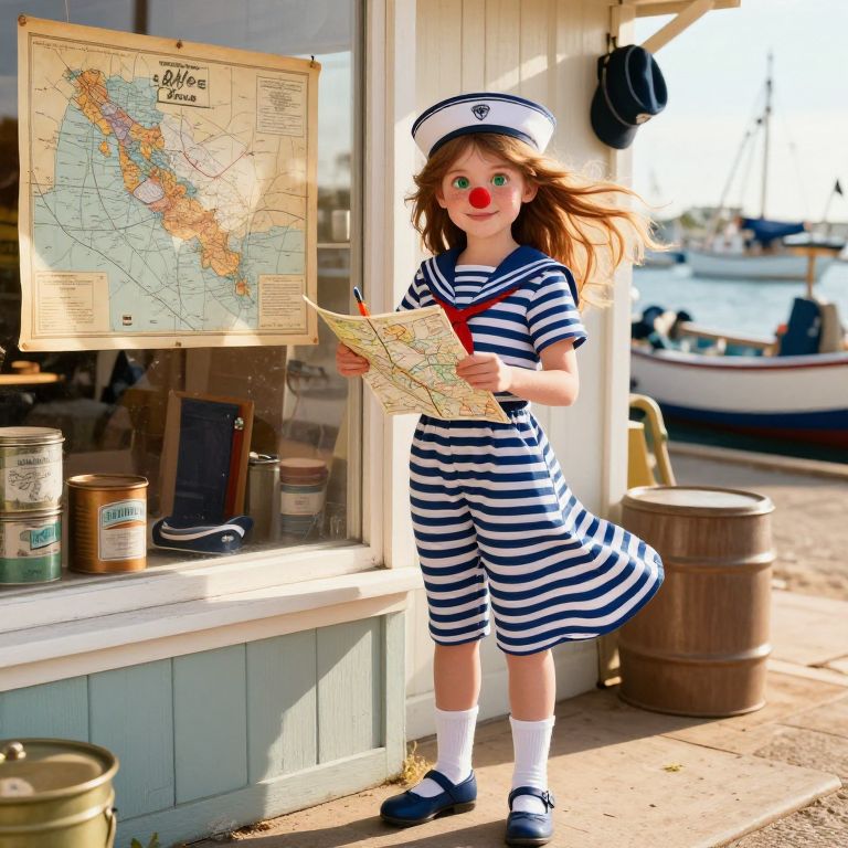 A lively sailor girl with freckles, a bright red nose, and lively green eyes stands next to a retro nautical store window, her nautical striped jumpsuit fluttering slightly in the wind. She wears white knee socks and blue sailor-style shoes, holding a map with a pencil. The shop displays old sea charts, tin cans, and sailor hats, and the scene is lit warmly by a golden afternoon sun with fishing boats anchored in the background.