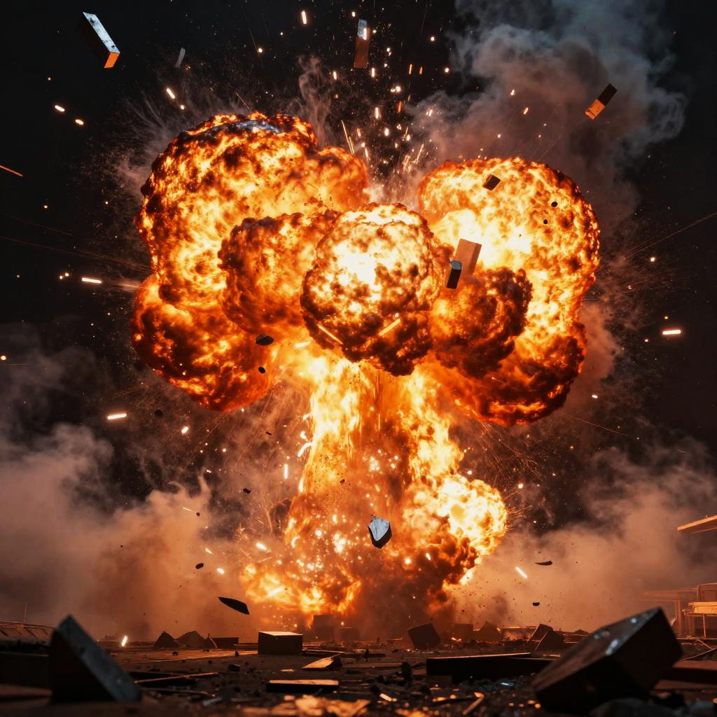 Realistic explosion drawing of a futuristic sci-fi battle scene, large explosion with vivid fireball and dense smoke, sparks and debris fragmented mid-air, metallic shards flying, glowing embers, high contrast colors, dramatic perspective and intense explosive energy.