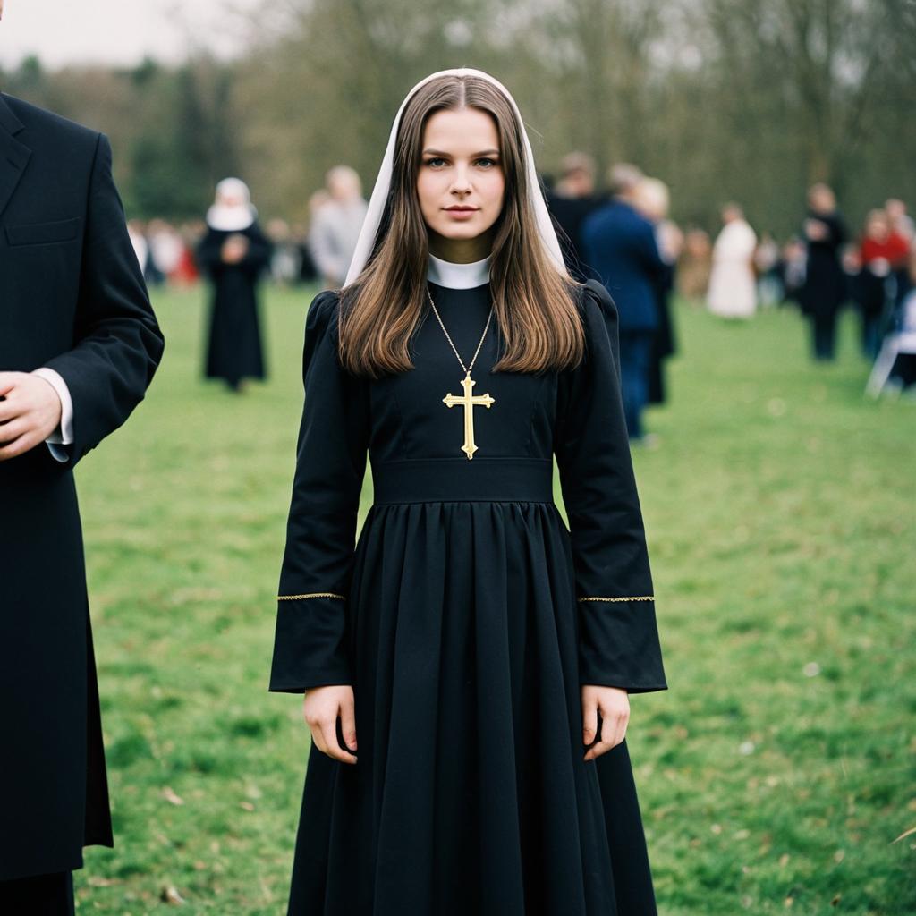 Church outfit woman,1girl, solo, realistic, looking at viewer, brown hair, church, standing, arms at sides, long sleeves, dress, blurry background, brown eyes, blurry, closed mouth