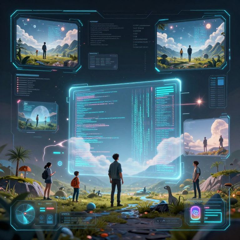 This digital artwork depicts a futuristic, sci-fi landscape with neon blue holographic interface overlays. Silhouetted figures of various ages and genders, including children, stand in a grassy, rocky terrain with distant mountains under a starry sky. The central hologram displays complex, glowing code and data. Insets show similar scenes with additional holographic elements. Palm trees and small rocks dot the foreground, while a glowing orb and a floating sphere add sci-fi elements. Bright, colorful, and detailed, the image blends natural and digital worlds, evoking a sense of exploration and discovery.